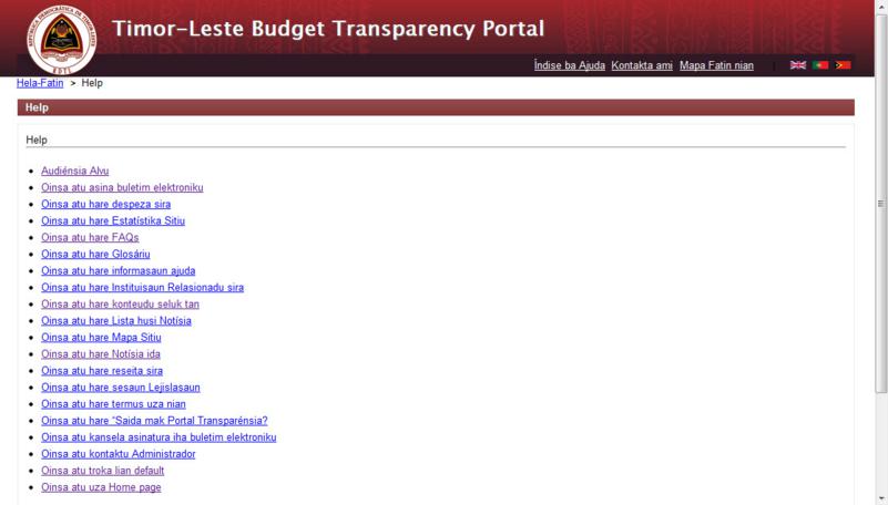 About Timor-Leste Budget Transparency Portal | Frequently Asked Questions | Need to Register? | Terms of use | Copyright | Related Institutions | Help | Legislation | Glossary | More Contents